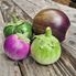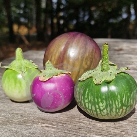 | Mélange coloré de 4 variétés d'aubergines à fruits ovoïdes de 5 cm de diamètre, de couleurs violet pâle ou violet foncé, verte et striée vert et blanc : lao lavender, thaï round purple, thaï round green et lao round green stripes. Plante rustique, notamment à la sécheresse, et précoce. |